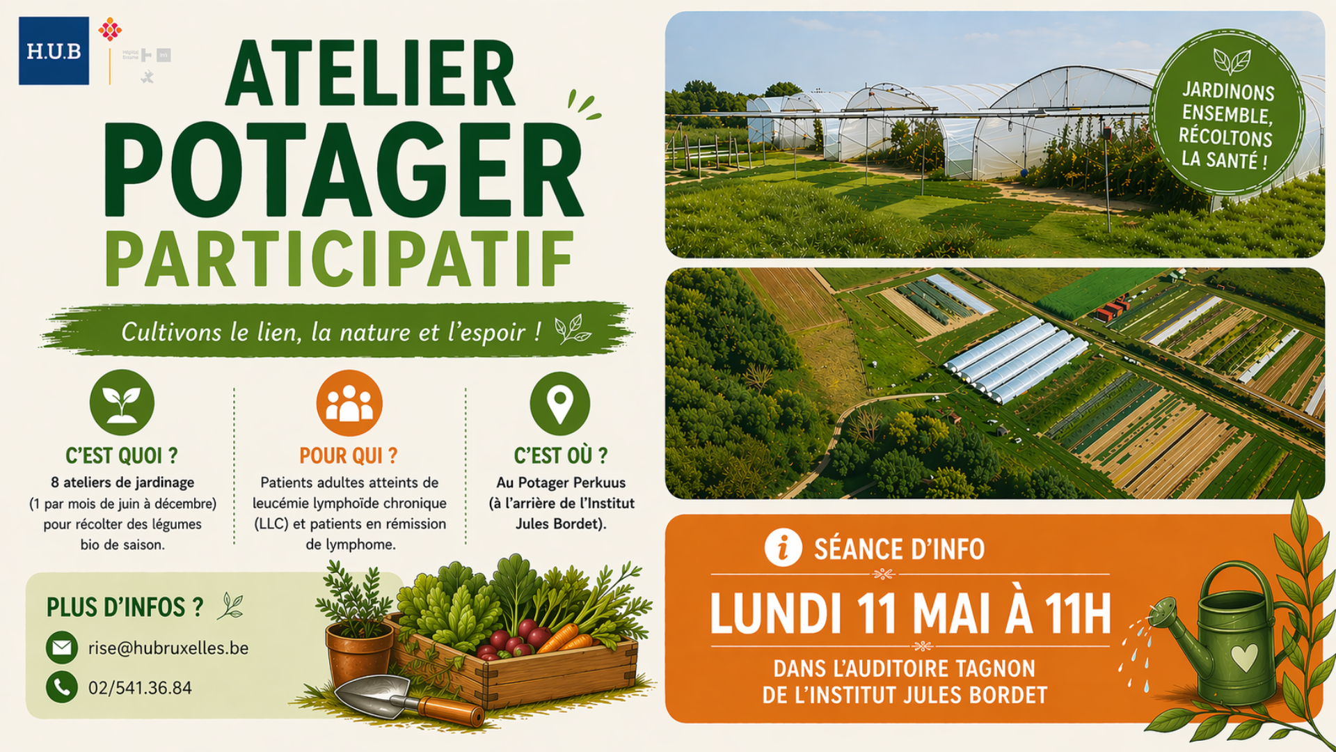 Dans le cadre des activités de soutien proposées aux patients d’hématologie, un programme d’ateliers intitulé « Potager participatif » est mis en place à l’arrière de l’Institut Jules Bordet. Cette initiative vise à compléter la prise en charge médicale par une approche axée sur le bien-être, le lien social et l’activité en extérieur.